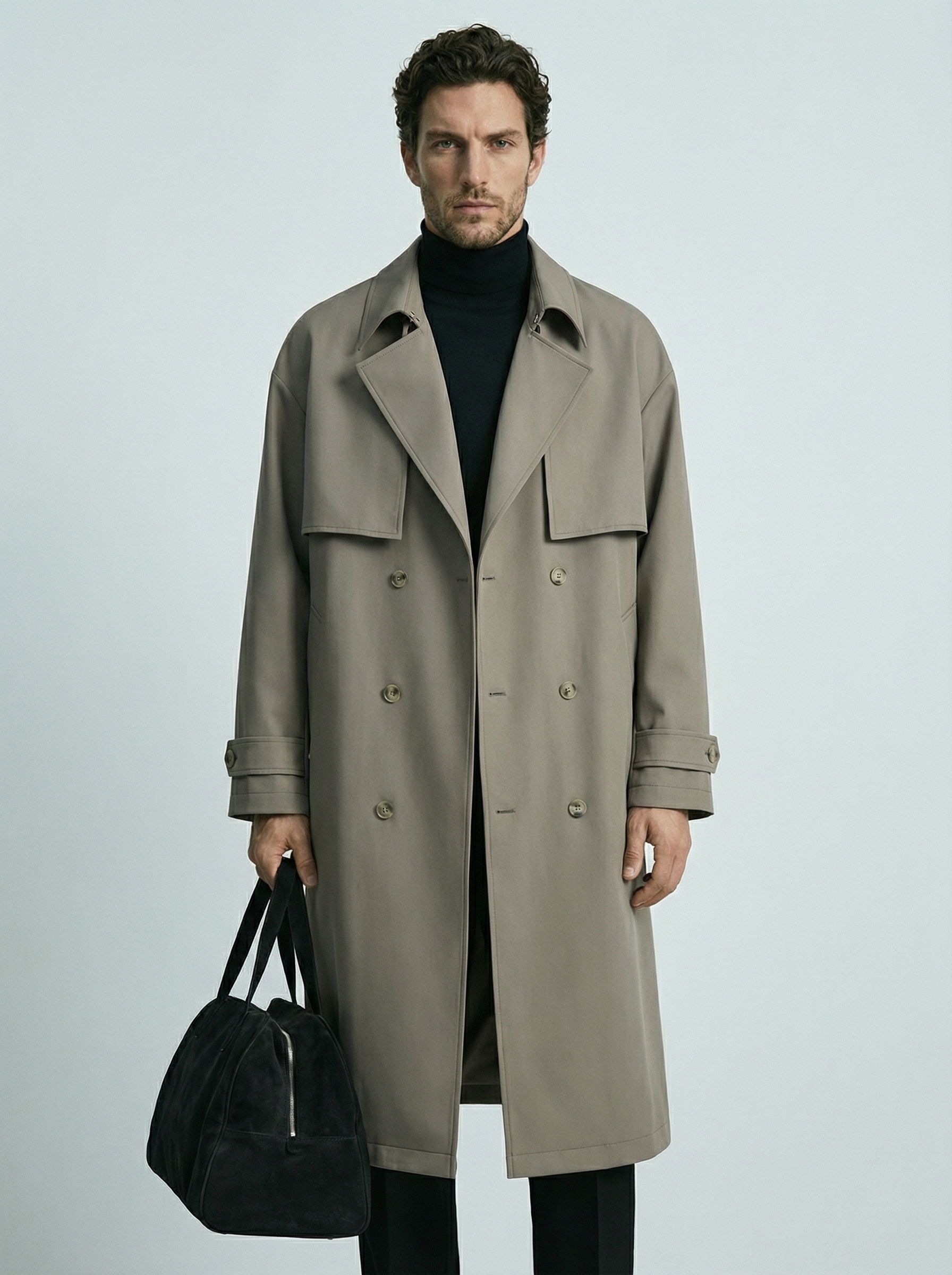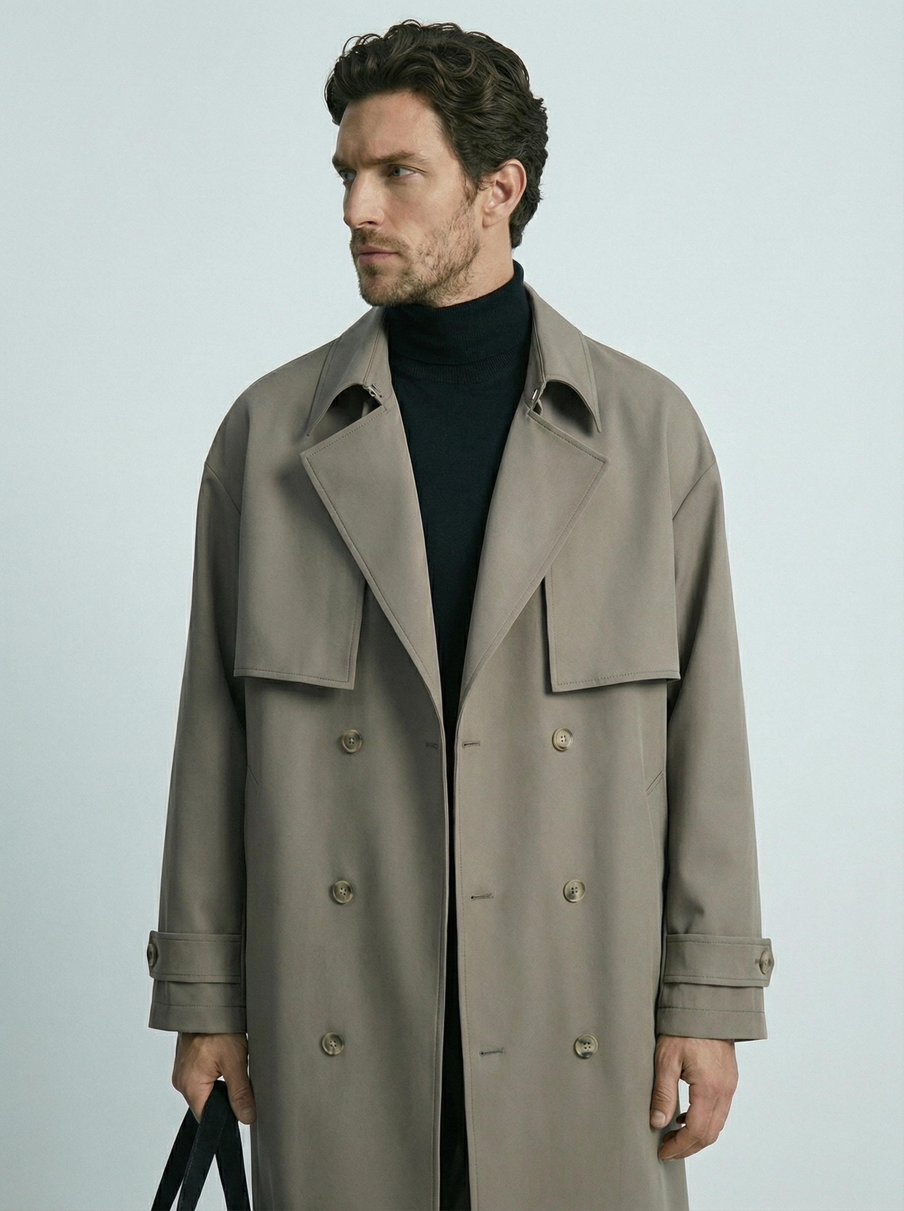 Minimalistinis siluetas su dvigubu užsegimu suteikia struktūrą ir išskirtinį charakterį.